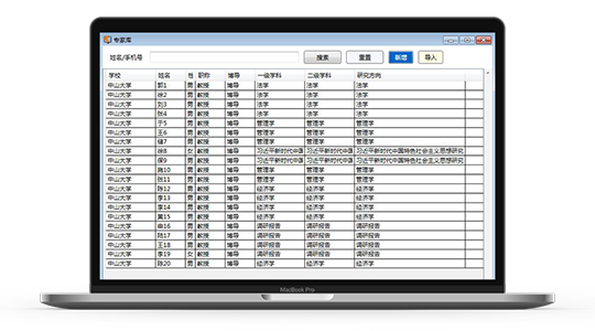 可通过专家所在学校、研究领域、参与项目等字段进行录入及查询,并可对指定日期、学科、项目的相关专家组进行信息调取。