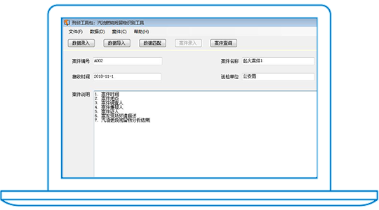 刑侦工具包:汽油燃烧残留物识别工具软件是基于微软 .Net 平台开发的专业软件,利用汽油图谱相似度匹配技术,提高刑侦工作中汽油燃烧残留物识别效率,为涉及到起火的案件侦破提供帮助。